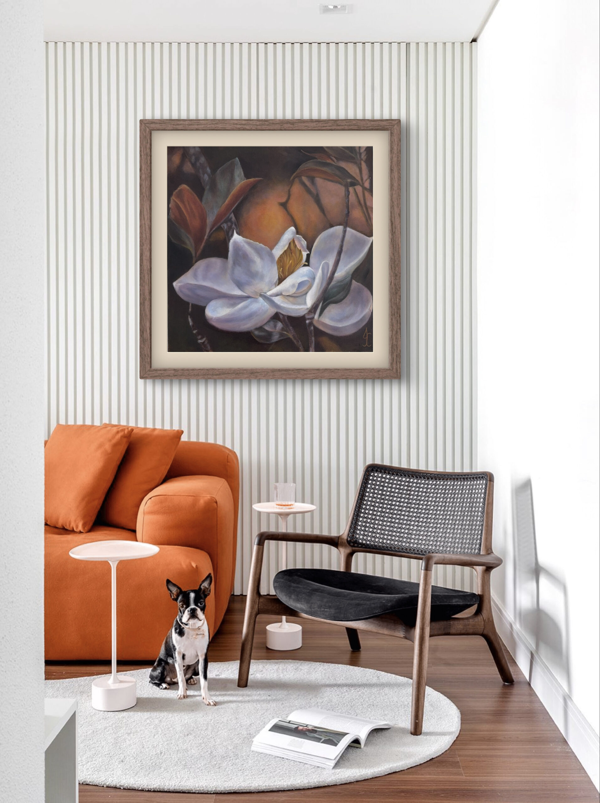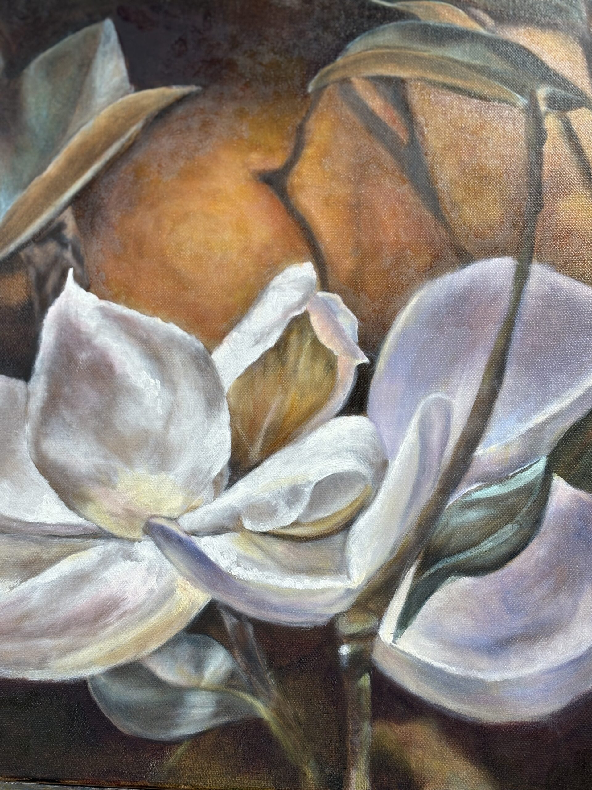 This is a captivating oil painting on canvas that explores depth and contrast through layered colors and rich textures. The focal point is a luminous white magnolia flower, depicted with delicate precision and a sculptural quality that brings the petals to life. The flower’s purity is emphasized by the background’s earthy and warm tones, which transition through layers of browns, reds, pinks, and subtle violets, creating a glowing, almost ethereal ambiance.